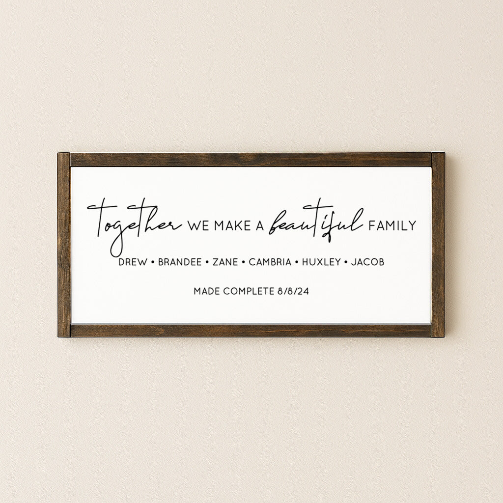 Celebrate family with this personalized canvas sign. Available in two sizes, it features a white canvas background with black matte vinyl lettering and a rustic brown frame. Easily hang with the included self-hanging system. Customize with names, dates, and choose from dots, hearts, or paw prints as separators. After ordering, you’ll receive a proof to approve, ensuring your sign is perfect. A heartfelt way to showcase your family’s story.