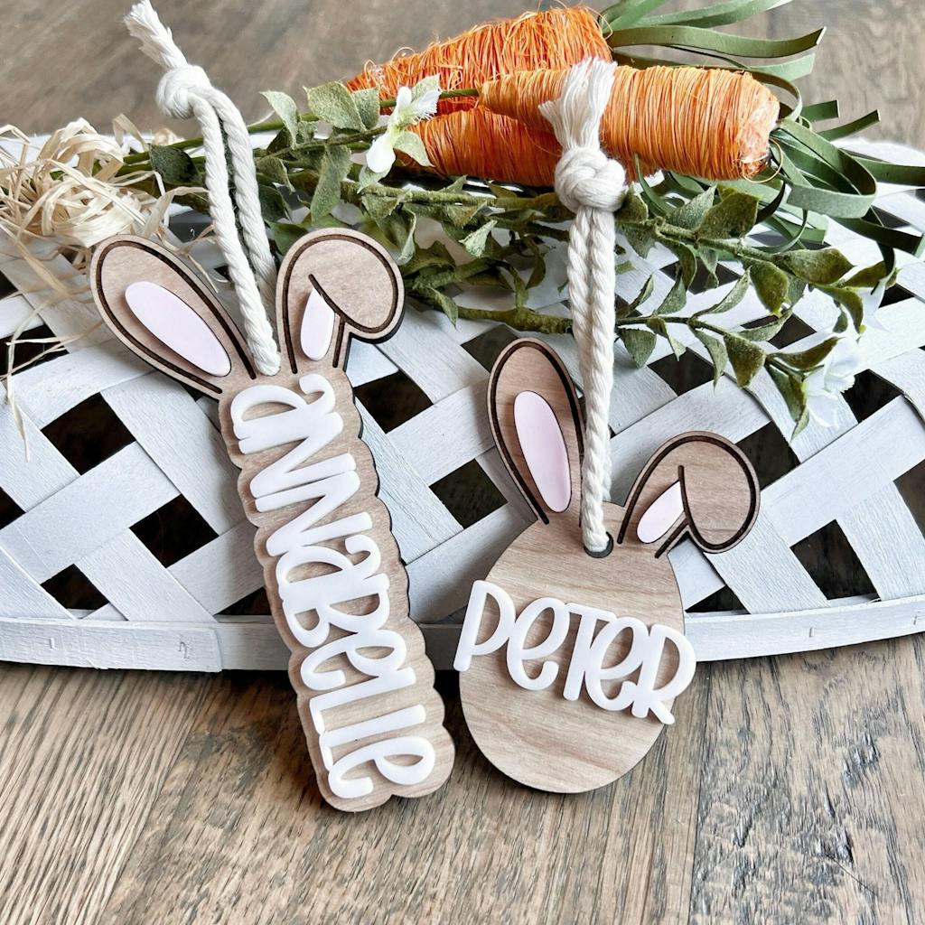 Introducing our NEW adorable Bunny Ear Easter Basket Tag for 2024, the perfect accessory to add a touch of whimsy to your kids' Easter baskets! This customizable name tag is not only functional but also a delightful way to personalize their baskets. Handcrafted with love, each tag features charming bunny ears and can be customized with your child's name. Made with durable materials, this tag will withstand the excitement of the Easter egg hunt year after year. Make their Easter extra special and memorable with our adorable Bunny Ear Easter Basket Tag!