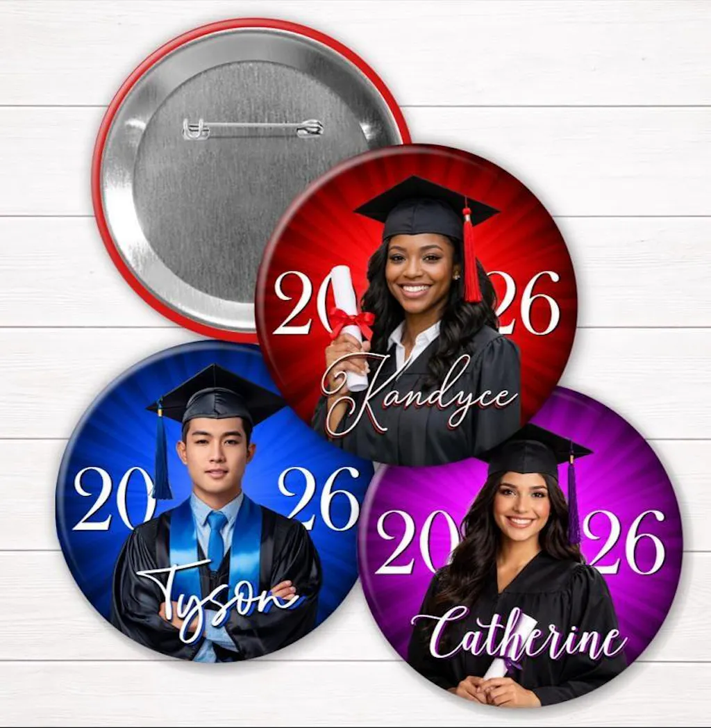 Celebrate your Class of 2026 senior with a personalized graduation photo button featuring their cap, gown, and diploma. These custom buttons highlight the classic graduation moment—perfect for senior portraits, ceremony day, and matching family pins. Each button is professionally printed for crisp detail, creating a keepsake your family will treasure long after graduation.
