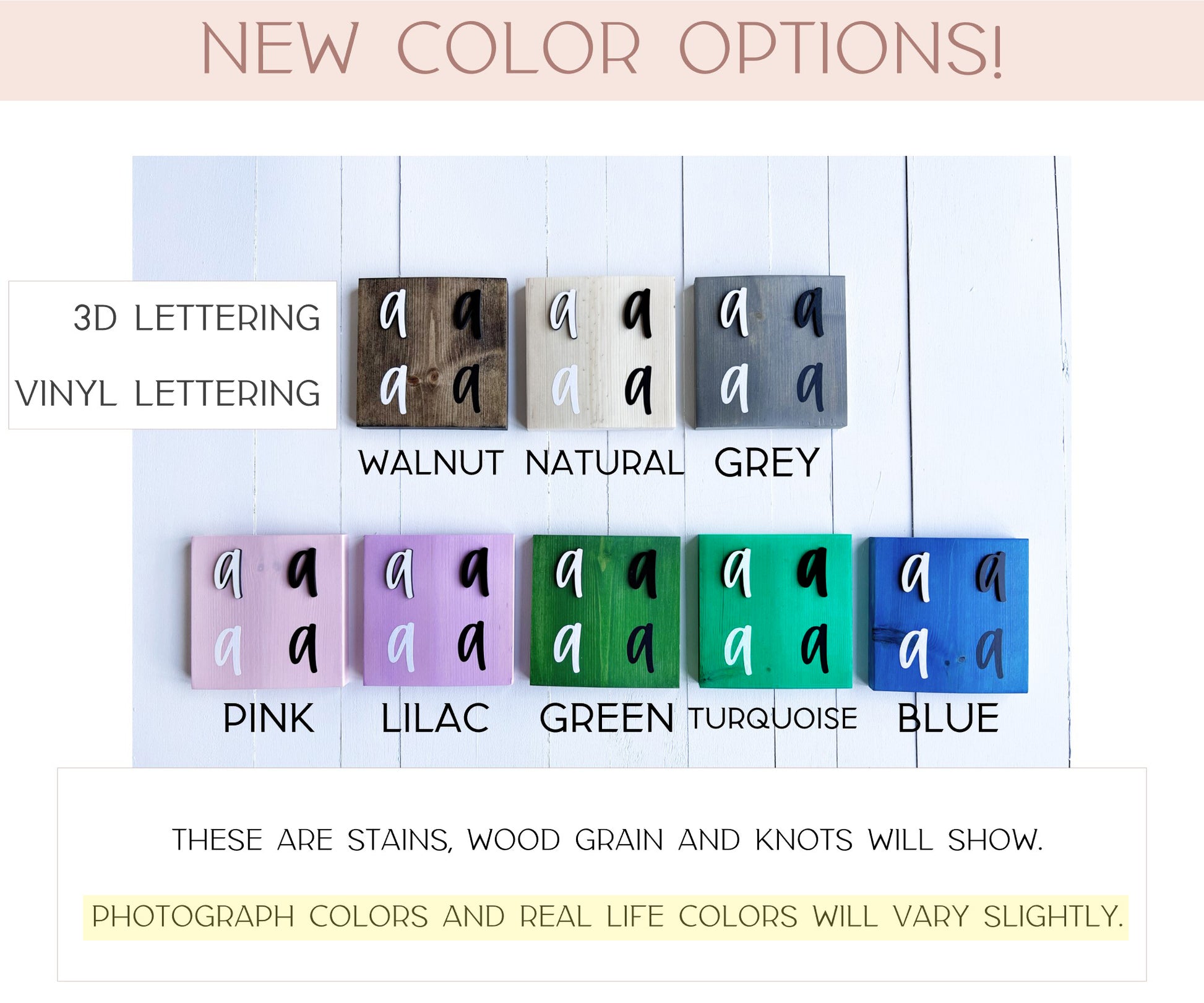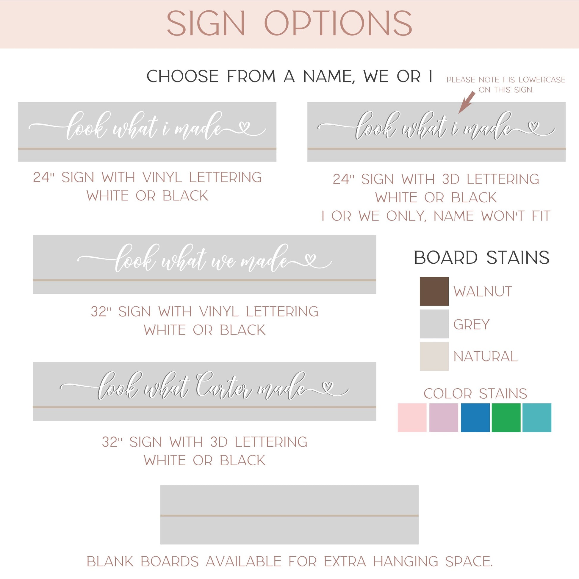 - Board Colors: Walnut, Natural, Grey, Pink, Turquoise, Blue, Lilac, Green, or White Washed (not shown in photo options)
