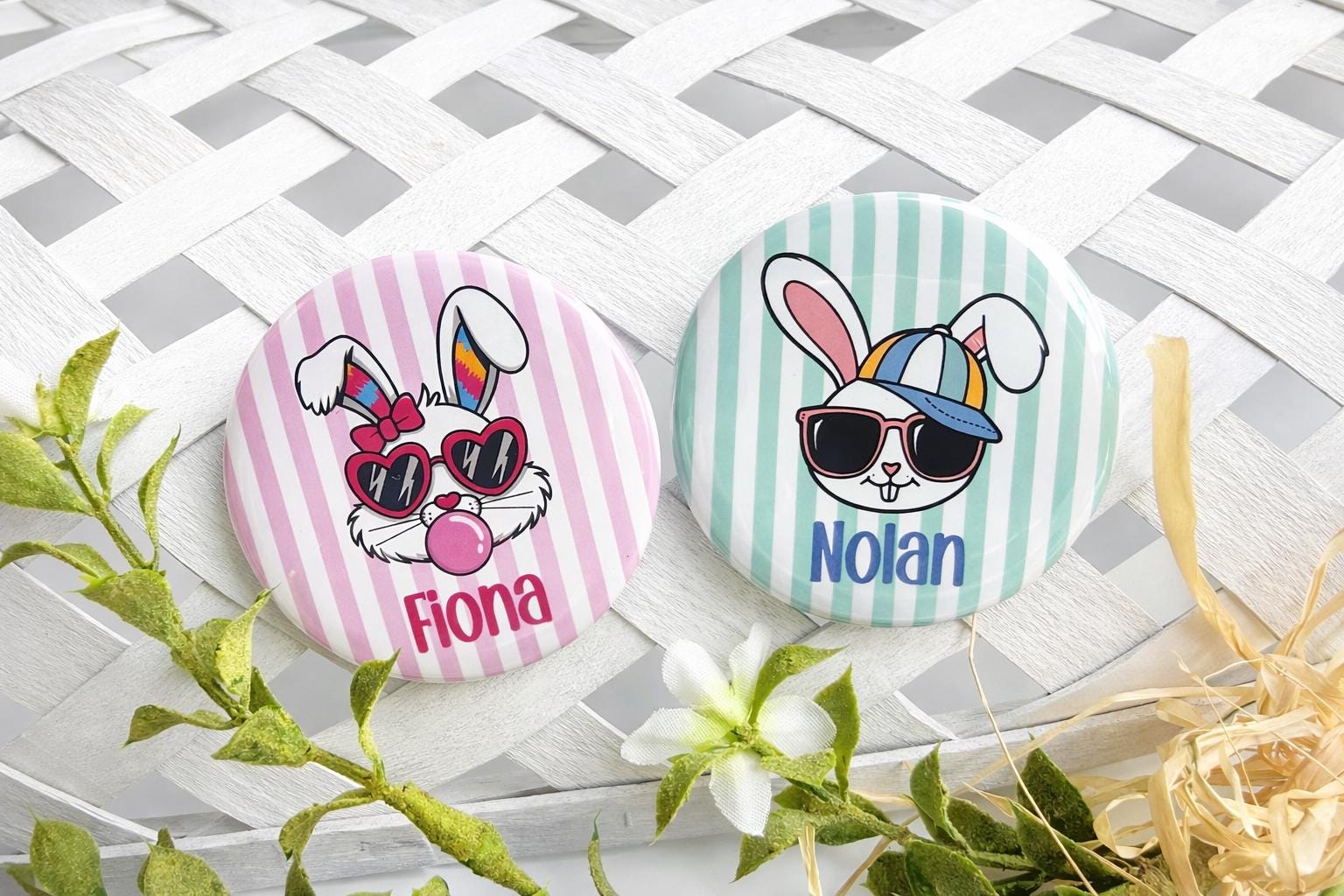 Personalized Easter Bunny Buttons for Kids – Bubblegum Bow or Cool Cap Designs
