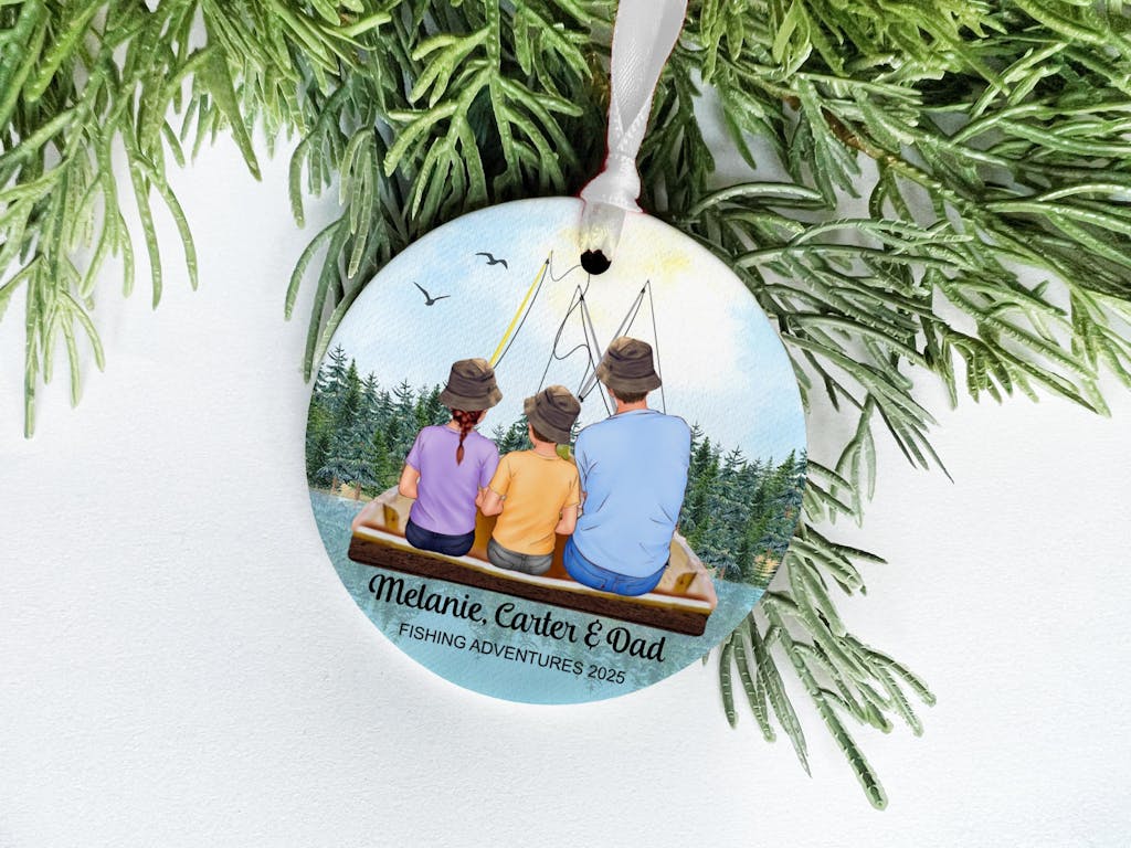 Customize your ornament with names, layouts, and hairstyles to reflect your unique family bond. A heartfelt gift for dads, grandpas, sons, and daughters who love casting lines and making memories.