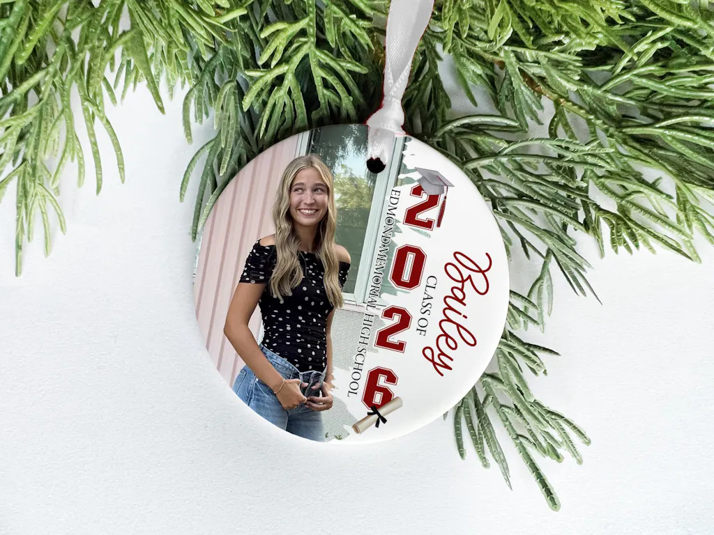 Celebrate a major milestone with this Personalized Graduation Photo Ornament—featuring your favorite senior snapshot and custom text for a keepsake that’s as meaningful as it is festive. Whether it’s for your own graduate or a thoughtful gift for proud grandparents, this ornament adds a personal touch to your holiday decor and honors the Class of 2026 in style. This ornament is universal between graduation years, any year works, 2025, 2026, 2027, 2028, 2029, 2030, etc.