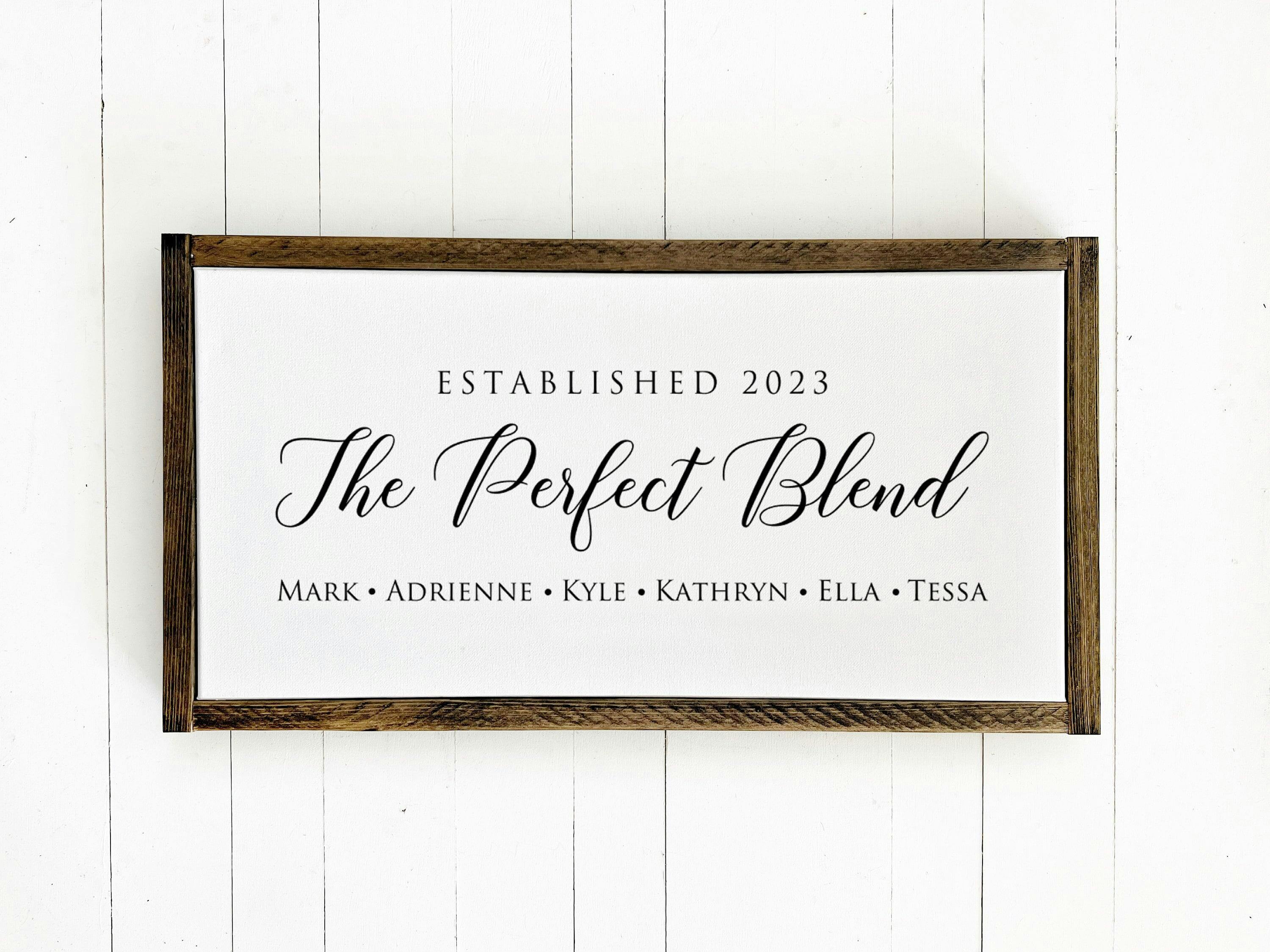 The Perfect Blend Sign is available in two sizes and features custom black matte vinyl lettering on a rustic brown frame with easy hanging. Personalize it with names, dates, and choose hearts, dots, or paw prints. Simply select your size, personalize, and complete your order. A proof will be sent in 1-3 days to ensure it’s just right.