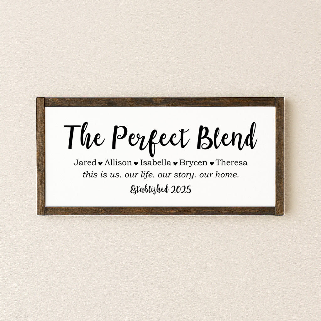 Celebrate your unique journey with this beautifully crafted sign featuring the words “The perfect blend. Our life, our story, our home.” Available in 10" x 22" or 12" x 22", it showcases high-quality black matte vinyl lettering on a white canvas background. The dark walnut-stained pine frame offers a warm, elegant finish. A proof will be provided within 1-3 days, and the frame includes a self-hanging system for easy installation—hang with care.